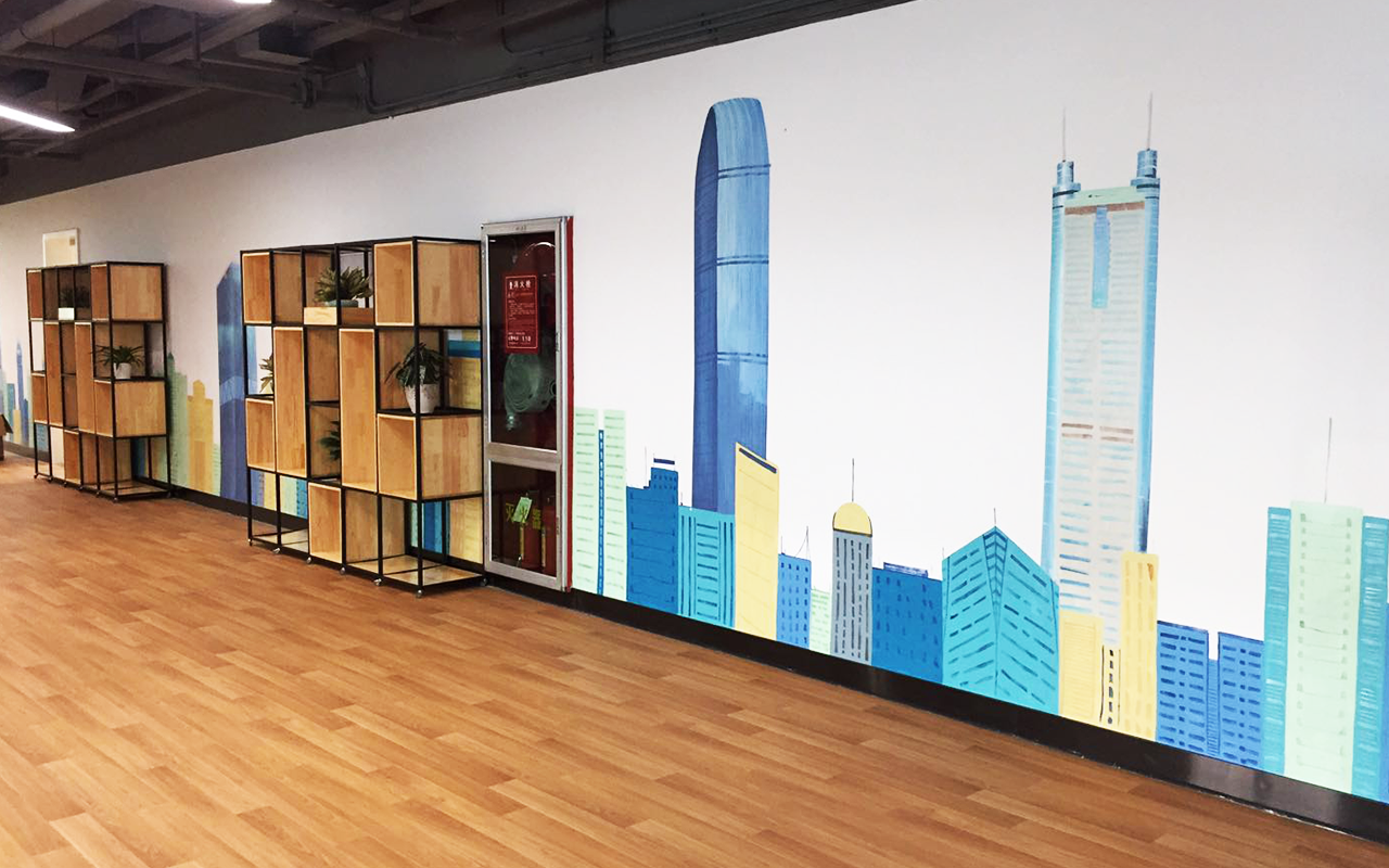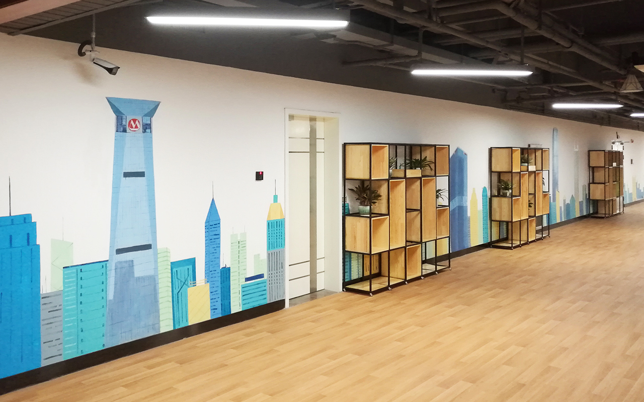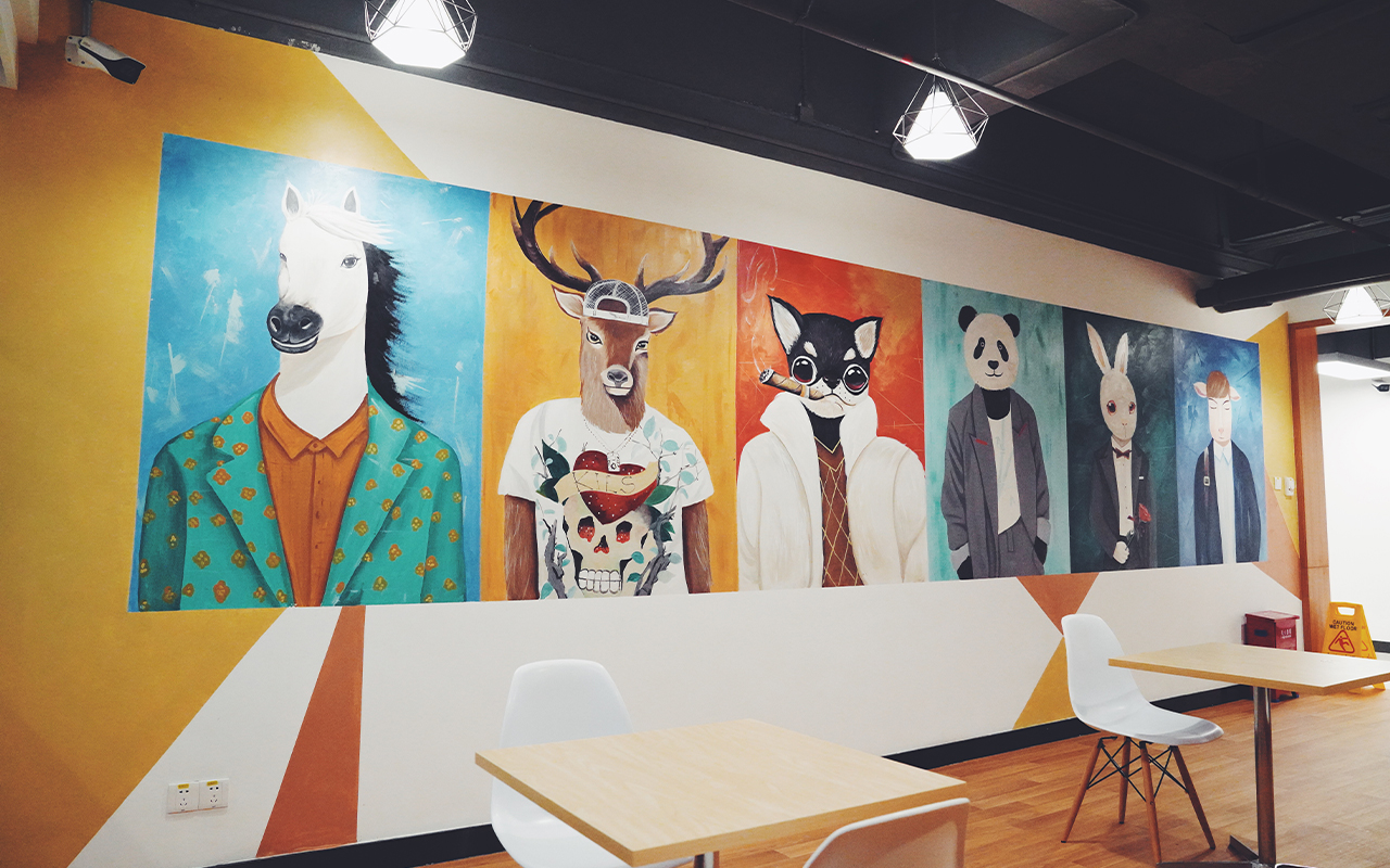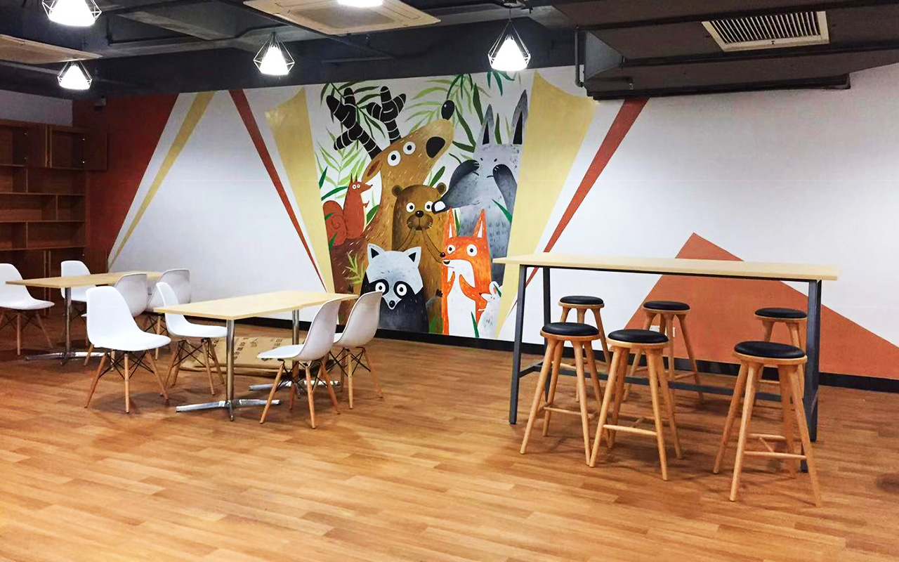 由于墻體普遍較大,我們采用大量原創墻繪(手繪)+輕型材料的解決方案