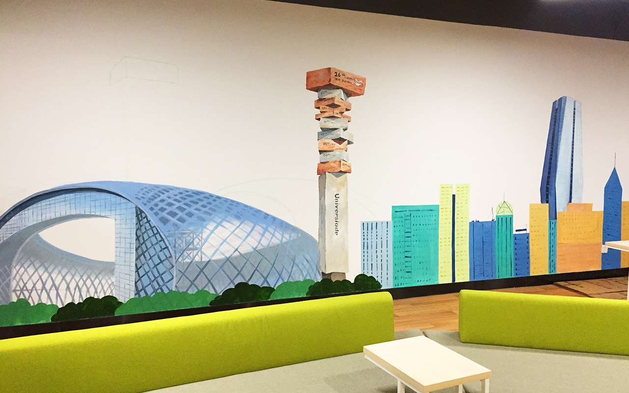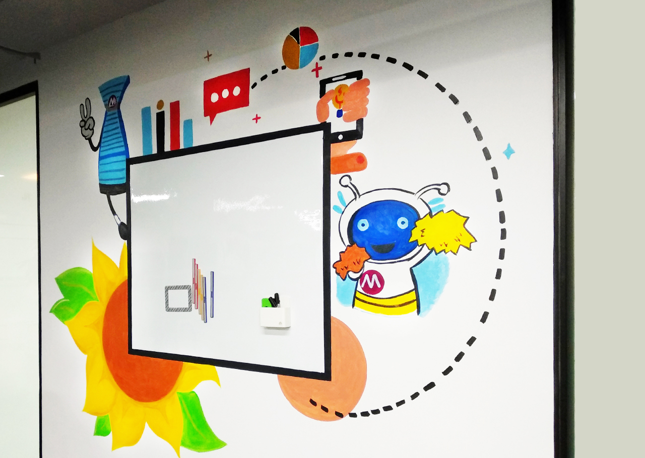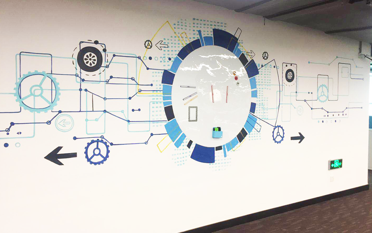 由于墻體普遍較大,我們采用大量原創墻繪(手繪)+輕型材料的解決方案